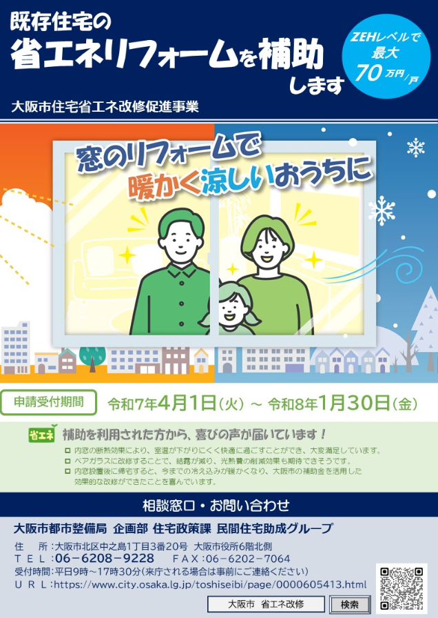 本日も最後までお読みいただき、ありがとうございます。大阪市で「断熱リフォーム」に取り組む私たちは、内窓や玄関の窓断熱を通じて、冷暖房の光熱費を抑える補助金活用を含めたご提案を大切にしています。「住まいが変われば暮らしが豊かに」──この想いを胸に、快適な住環境づくりをこれからもサポートしてまいります。